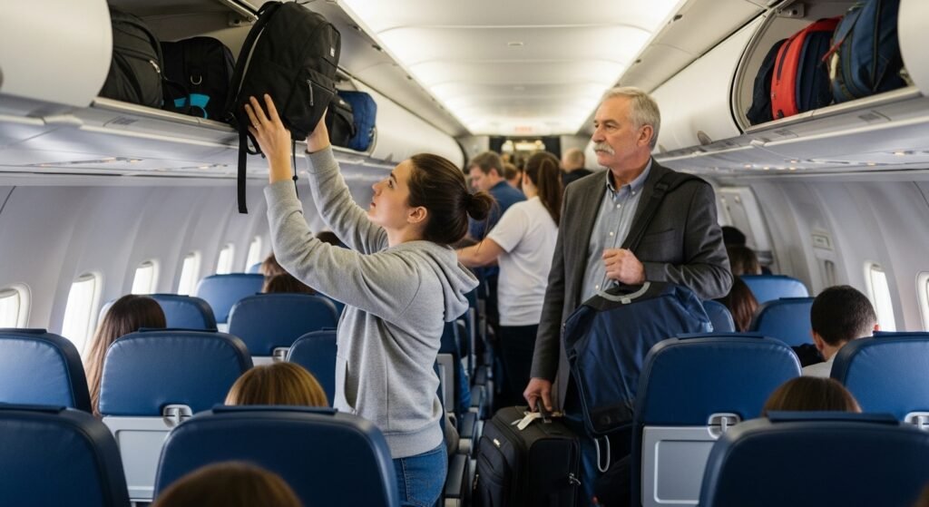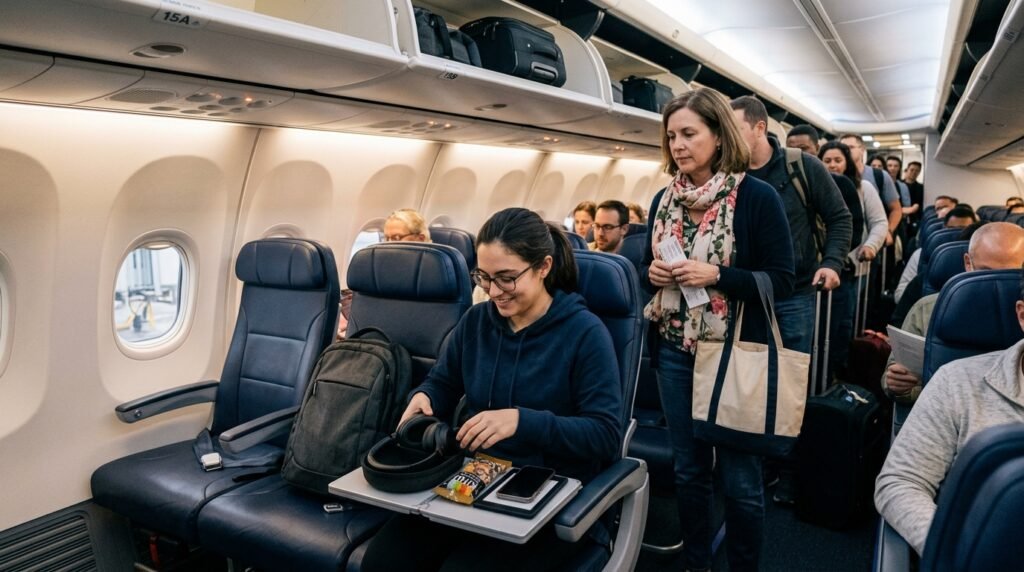 At times, passengers begin unloading even before they sit down. They are looking at the headphones, snacks, or chargers. Meanwhile, there are others in the aisle. It is best to sit in the first position and organize afterward to have a smooth boarding.