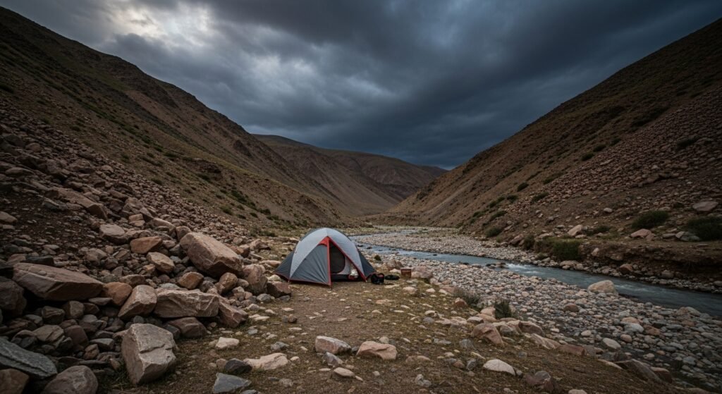 At first a campsite may seem like a great place. However, it may be dangerous to establish close to dry riverbeds, loose rocks, or lowlands. Overnight problems can be caused by the sudden rain or changing terrain. The place where a camp should always be is stable and slightly elevated.
