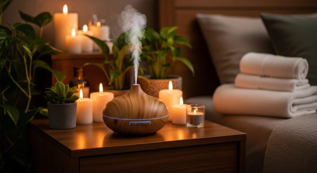 A diffuser of aromatherapy will be the final touch on the spa experience as it will fill the air with relaxing aromas. Essential oils can be used to reduce stress, boost mood and have a sense of immersion that turns your house into your personal sanctuary.