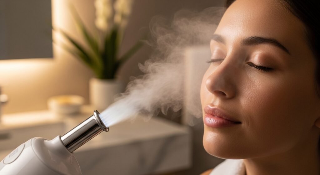 Facial steamer dilates the pores, hydrates the skin and improves circulation, which enhances any other steps of skincare. It gets your face ready to be washed and covers the face with a mask and sets a relaxing spa kind of mood that makes you stop, breath and relax completely.