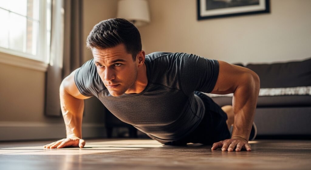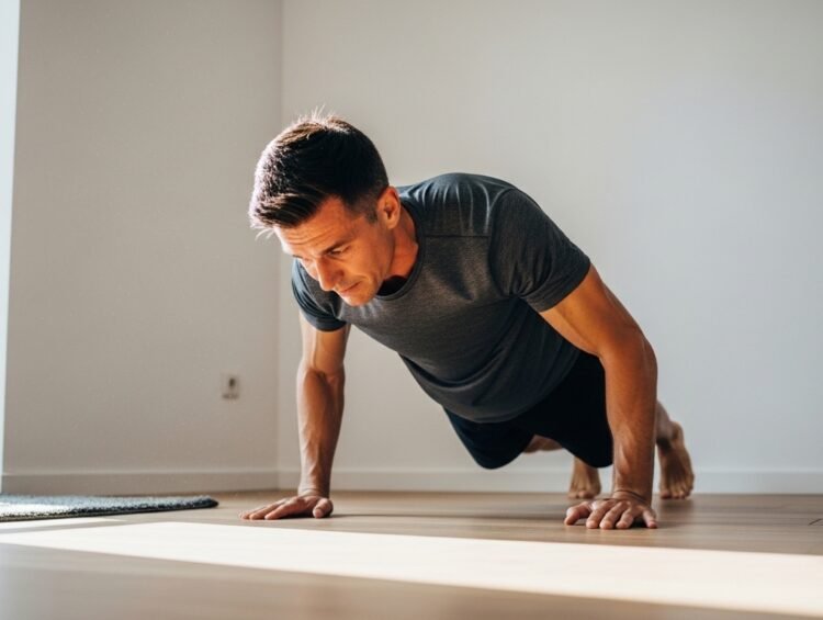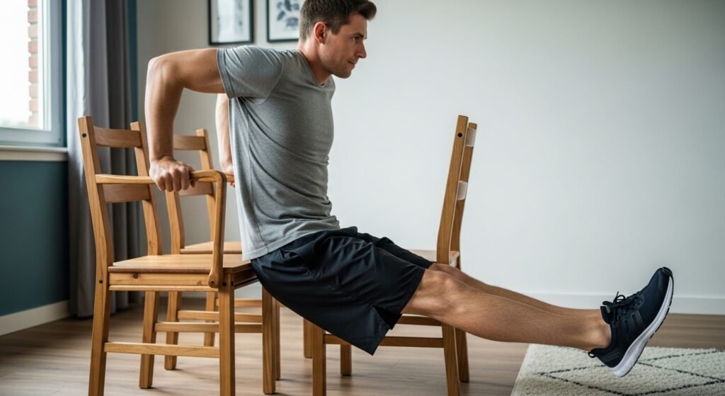 Two stable chairs, hands gripping the edges, lower the body until the elbows hit ninety degrees, push back up. Dips target the triceps and chest in a way push-up variations simply cannot replicate. Most men are surprised how quickly this movement humbles them — and how fast it builds visible arm strength when done consistently.