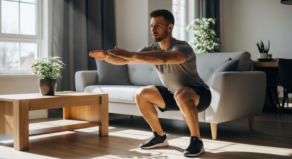 Every man wishes for sturdy legs and a sturdy lower back. Squats manage each one. Feet shoulder-width apart, chest up, drop until the thighs are parallel to the ground, and press up again. No weight needed — bodyweight squats done with proper form and real depth build more functional strength than half-repped squats with a loaded bar.