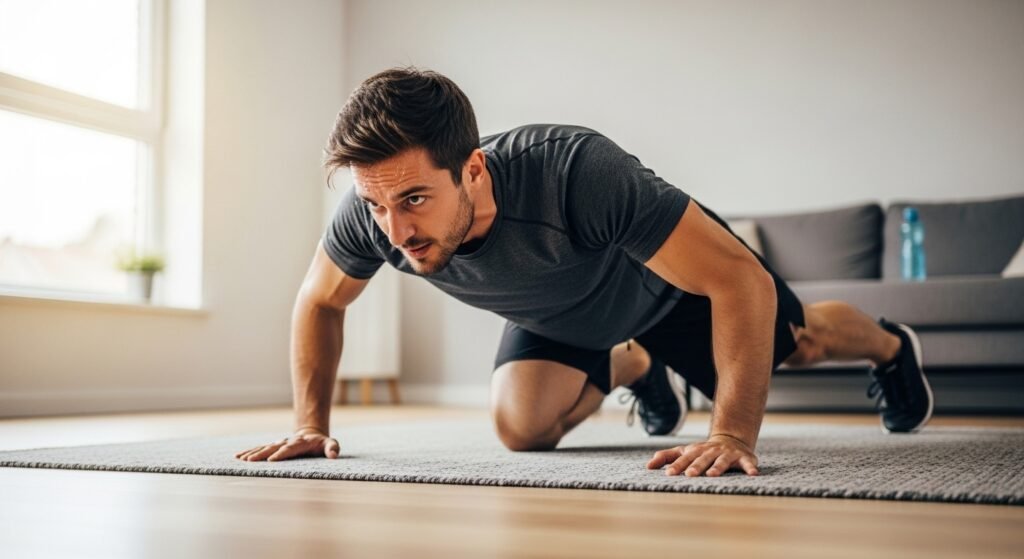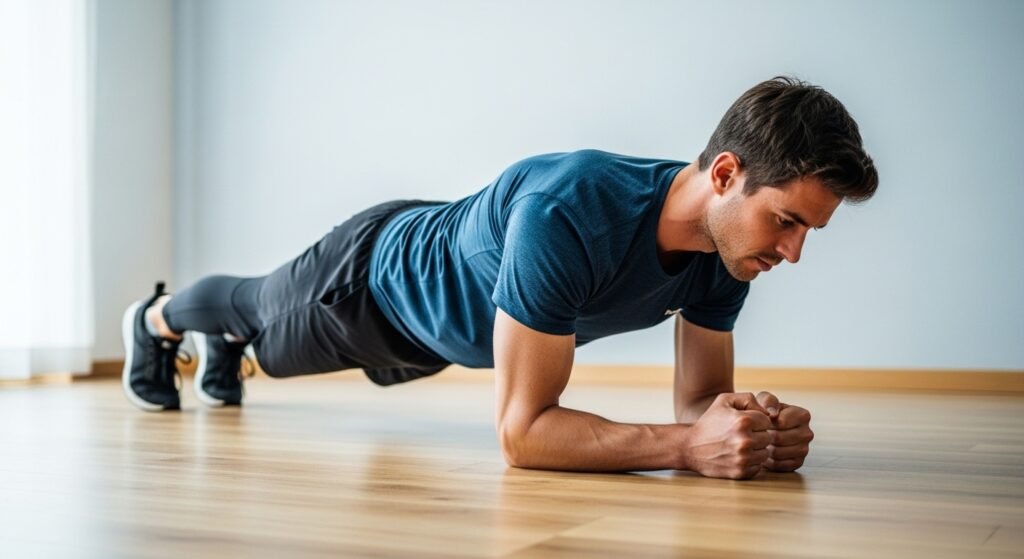 One minute of plank does more for a man’s core than a hundred crunches. The entire midsection has to work to hold the body in a straight line — abs, lower back, glutes, and shoulders. Hold for as long as the form stays perfect. The moment the hips drop or rise, the set is over.