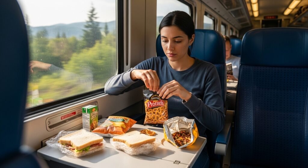 Some trains have great dining cars and some have almost nothing. A few snacks in the bag solves this completely.