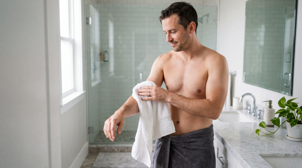 Rubbing aggressively with a towel causes friction that breaks down pores and skin elasticity over the years. Patting dry gently takes the same amount of time and removes the repeated daily damage that nobody thinks twice about until the skin starts showing it.